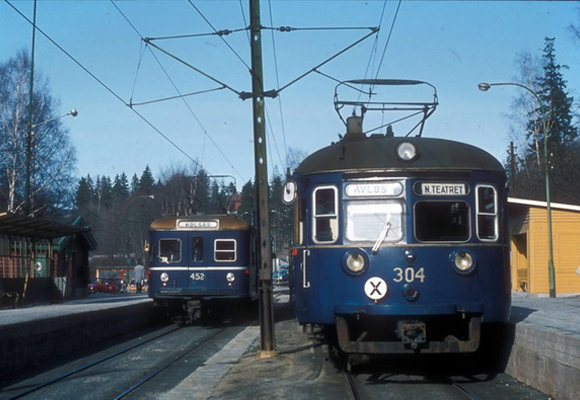 V-452 var i drift på Bærumsbanen fra 1960 til 1970 for prøvekjøring. Så ble den flyttet over til drift. Her møter den C-304 på Jar T-banestasjon. Året er 1974. Nostalgia. Syvende runde. Forgjengeren til T-1000 og T-1300 seriene.